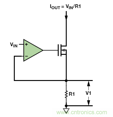 該電路簡單、價格不高。MOSFET柵極上的電壓可設(shè)置MOSFET中的電流和R1,使R1 上的電壓V1 等于輸入電壓VIN。
