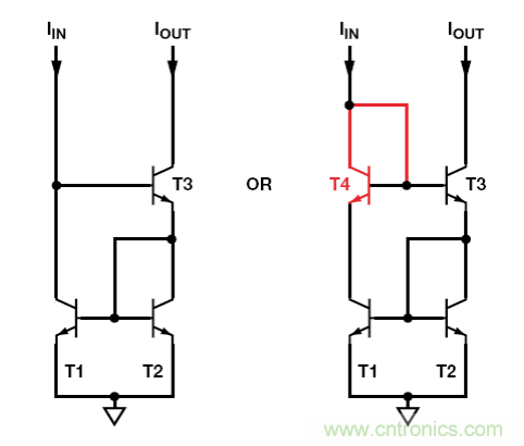 若早期電壓影響很大,則可使用略為復(fù)雜的威爾遜電流鏡降至最低。3 晶體管和 4 晶體管版本如圖 3 所示。4 晶體管版本更為精確,且具有更寬的動態(tài)范圍。