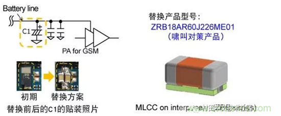 替換方案如下所示。替換產(chǎn)品選擇嘯叫對策用MLCC、ZRB18系列。如下面貼裝照片所示,貼裝面積減少50%。