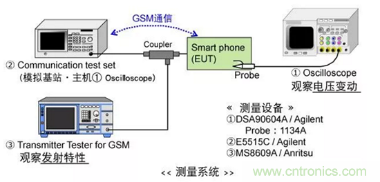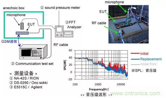 本次置換評估中,對GSM通信時的①發(fā)射特性、②蓄電池的電壓變動和③嘯叫進行評估。