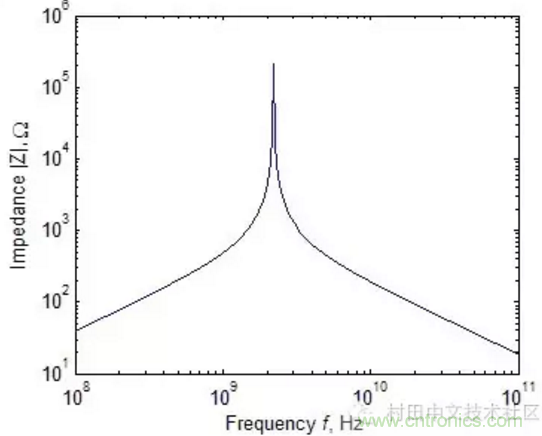 同樣可以得到一個(gè)典型的電容器的阻抗絕對(duì)值與頻率的關(guān)系。如下圖所示,由于存在介質(zhì)損耗和有限長(zhǎng)的引線,電容顯示出與電阻同樣的諧振特性。