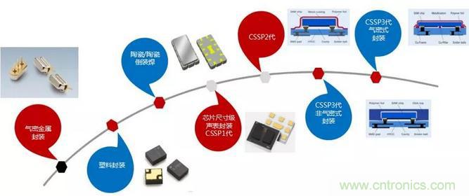 SAW器件封裝要求:(1)器件有源表面必須有一定空間;(2)襯底和封裝材料必須有良好的熱匹配;(3)防止?jié)駳饨撕臀⒘U次?。先后?jīng)歷過氣密金屬封裝、塑料封裝、陶瓷封裝、陶瓷倒裝焊、芯片尺寸級聲表封裝CSSP等幾個階段,針對不同的客戶需求和應(yīng)用場景這些封裝方案依然共存,但是器件的小型化是大勢所趨。