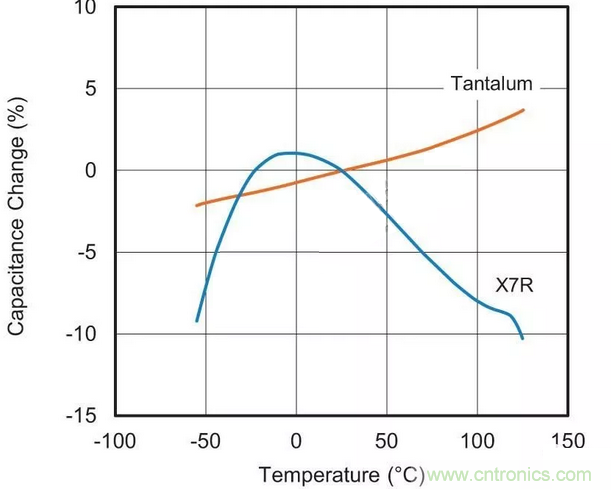 用于替換最可能的MLCC候選者采用“II類”電介質(zhì)材料。這種II類陶瓷(通常為X7R或X5R)的容值會在溫度范圍內(nèi)變化,這種特征稱為電容溫度系數(shù)(TCC),參見圖1。