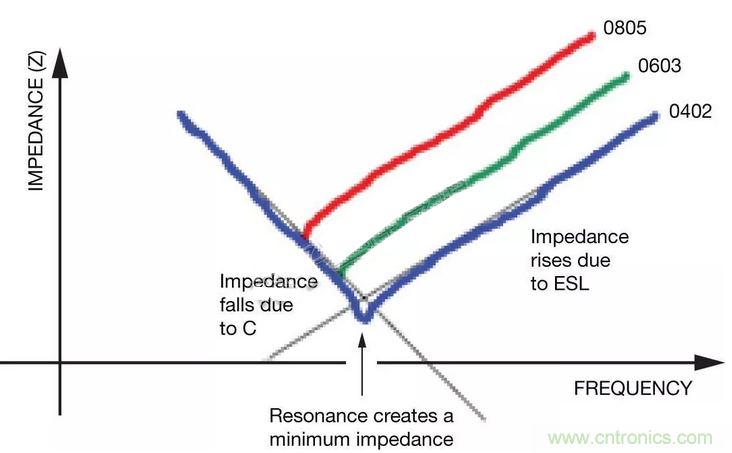 高速電路是一個例外,其中的感應(yīng)負載可能會延遲傳送來自電容的所需電流,從而影響電路性能。阻抗(Z)的影響因外殼尺寸而有不同,如圖4所示。