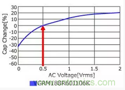 測定條件20℃、1KHz時的MLCC的AC電壓特性如下圖所示。