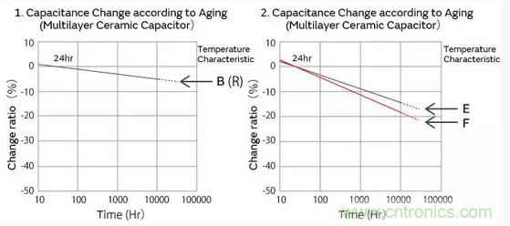 高誘電系的積層陶瓷電容器的靜電容量,以經(jīng)過125℃以上的熱處理24小時后的值作為基準(zhǔn),與時間成對數(shù)關(guān)系直線性下降。請參考如下本公司制品靜電容量老化特性的代表例子。