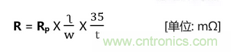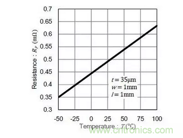 此外,如果知道每單位面積銅的電阻值Rp在不同溫度下的變化(如下圖資料所示),可以使用以下公式估算整個(gè)銅的電阻值R。注意下圖銅的尺寸是:厚度(t)35μm,寬度(w)1mm,長度(?)1mm。