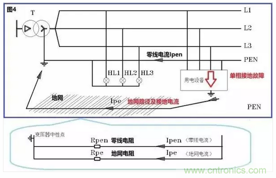 我們看圖4的下圖,我們發(fā)現(xiàn)當(dāng)L3相對(duì)用電設(shè)備的外殼短路時(shí),保護(hù)性中性線中有電流流過(guò),地網(wǎng)中也有電流流過(guò)。