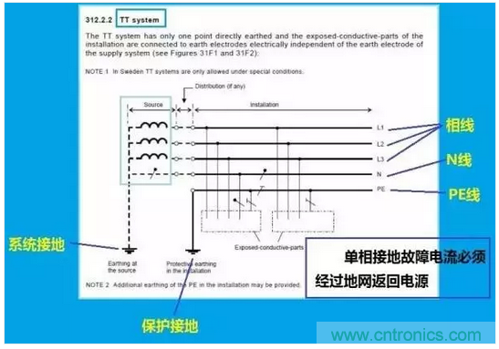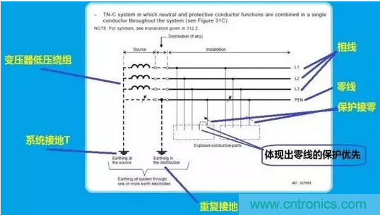 知曉這幾個(gè)概念后,我們來(lái)看看IEC給出的有關(guān)TN-C和TT系統(tǒng)的原圖。注意,這兩幅圖是不容置疑的,是有關(guān)接地系統(tǒng)的權(quán)威解釋。