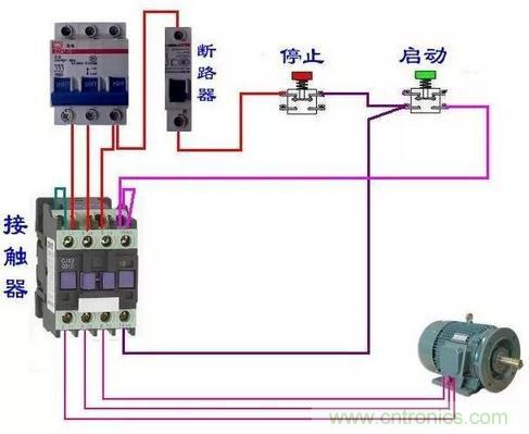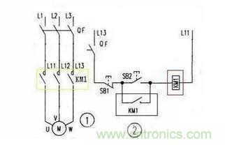 上圖是用接觸器控制電機的原理圖,圖1是主回路,圖2是控制回路,圖中黃色框內(nèi)就是接觸器的主觸點,藍色框內(nèi)是接觸器的輔助觸點,紅色框內(nèi)是接觸器的線圈。SB2是起動按鈕,SB1是停止按鈕,當(dāng)按下SB2時KM1線圈得電吸合,同時藍色框內(nèi)的KM1輔助觸點也閉合,松開SB2電機照常轉(zhuǎn)動,按下SB1時電機停止。下圖時交流接觸器接線圖,可以與上圖對照一下。