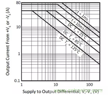 圖8:研究安全工作區(qū)域 (SOA) 曲線圖至關(guān)重要。ADHV4702-1的DC SOA由曲線下方的區(qū)域表示,曲線對應(yīng)的環(huán)境溫度分別為25°C和85°C,增益為20V,供電電壓為±110伏。(圖片來源:Analog Devices)
