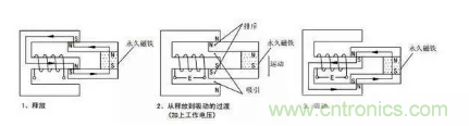 由永久磁鐵保持釋放狀態(tài),加上工作電壓后,電磁感應(yīng)使銜鐵與永久磁鐵產(chǎn)生吸引和排斥力矩,產(chǎn)生向下的運動,最后達到吸合狀態(tài)。