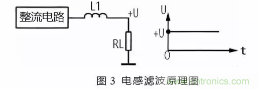 圖 3 所示是電感濾波原理圖。由于電感 L1 對直流電相當(dāng)于通路,這樣整流電路輸出的直流電壓直接加到負(fù)載 RL 上。