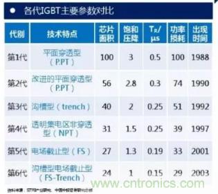 1985年前后美國GE成功試制工業(yè)樣品(可惜后來放棄)。自此以后, IGBT主要經(jīng)歷了6代技術及工藝改進。
