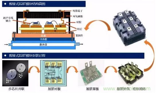 IGBT模塊按封裝工藝來看主要可分為焊接式與壓接式兩類。高壓IGBT模塊一般以標準焊接式封裝為主,中低壓IGBT模塊則出現(xiàn)了很多新技術,如燒結取代焊接,壓力接觸取代引線鍵合的壓接式封裝工藝。