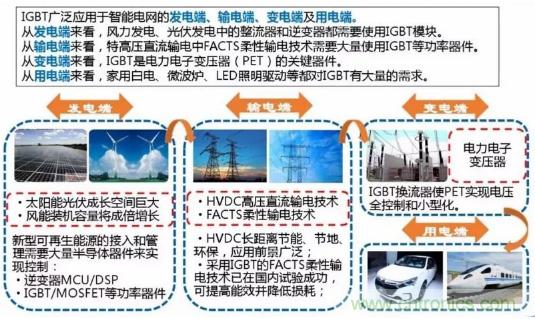 IGBT廣泛應用于智能電網(wǎng)的發(fā)電端、輸電端、變電端及用電端: