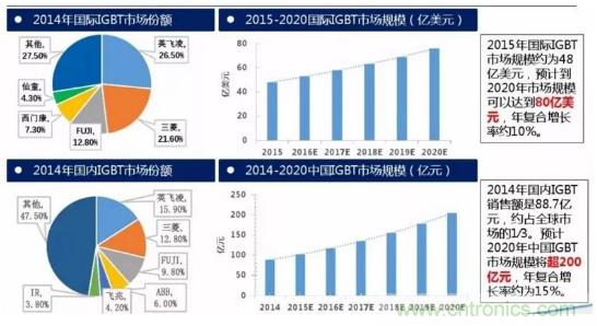 2015年國際IGBT市場規(guī)模約為48億美元,預計到2020年市場規(guī)??梢赃_到80億美元,年復合增長率約10%。2014年國內(nèi)IGBT銷售額是88.7億元,約占全球市場的1∕3。預計2020年中國IGBT市場規(guī)模將超200億元,年復合增長率約為15%。