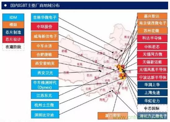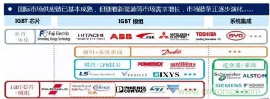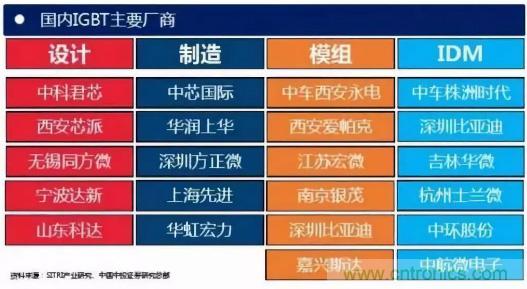 從公司來看,國外研發(fā)IGBT器件的公司主要有英飛凌、 ABB、三菱、西門康、東芝、富士等。中國功率半導體市場占世界市場的50%以上,但在中高端MOSFET及IGBT主流器件市場上,90%主要依賴進口,基本被國外歐美、日本企業(yè)壟斷。
