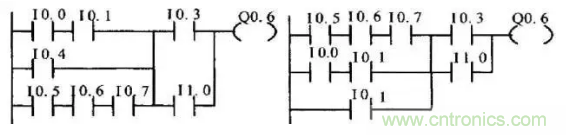 (3)幾個串聯(lián)支路相并聯(lián),應(yīng)將觸點多的支路安排在上面;幾個并聯(lián)回路的串聯(lián),應(yīng)將并聯(lián)支路數(shù)多的安排在左面。按此規(guī)則編制的梯形圖可減少用戶程序步數(shù),縮短程序掃描時間。