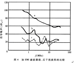 EMI濾波器能有效抑制單片開關(guān)電源的電磁干擾。圖4中曲線a為不加EMI濾波器時(shí)開關(guān)電源上0.15MHz~30MHz傳導(dǎo)噪聲的波形(即電磁干擾峰值包絡(luò)線)。曲線b是插入如圖3(d)所示EMI濾波器后的波形,能將電磁干擾衰減50dBμV~70dBμV。顯然,這種EMI濾波器的效果更佳。