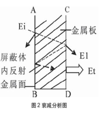 屏蔽的效果與頻率、屏蔽體的幾何形狀、材料性質(zhì)等因素有關,在分析這些因素并在實際應用屏蔽措施時,金屬屏蔽體對輻射波的衰減作用的機理研究尤為重要。金屬板屏蔽體對電磁波的衰減可由圖2來說明,當電磁波Ei入射到金屬板上時,一部分由AB表面AB反射,另一部分進入金屬體內(nèi),而在途中被不斷衰減后達CD面,這時其中又有一部分經(jīng)E1透過CD面從金屬板內(nèi)穿出,另一部分則由CD面反射,仍在金屬板內(nèi)部傳播,同樣有一部分穿過AB面穿出,一部分仍在AB面反射。這樣在金屬板內(nèi)多次反射和傳播,則透過金屬屏蔽的電磁波總和E-En=Et。