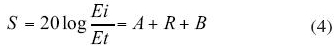 其中:A為厚度為t的屏蔽板內(nèi)電磁波傳輸中的損耗;B為反射損耗系數(shù);R為入射損耗系數(shù);S的單位為dB。