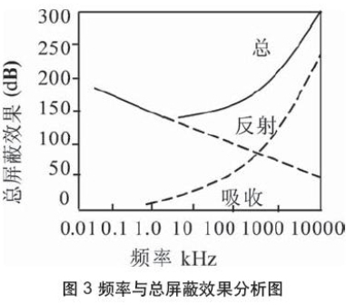 吸收損耗與屏蔽介質(zhì)厚度成正比,與集膚深度成反比。從頻率角度看,吸收損耗隨頻度增加而增加,這是由于集膚深度隨頻率增加而減小造成的。反射損耗從圖3可以看出將隨頻率增加而降低,而吸收損耗隨頻率的增加而增加,最小的屏蔽效果出現(xiàn)在中頻頻率。對于低頻平面波的大量衰減是由于反射損耗,而高頻時大量損耗是由于吸收損耗。
