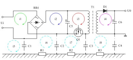 另外,還有4個回路電流i5、i6、i7、i8,這四個回路電流一般人是不會太注意的。這四個電流與前面的3個電流i1、i2、i3基本沒有直接聯(lián)系,它們都是通過電磁感應(電場與磁場感應)產生的。在這幾個電流中,其中以i7最嚴重,因為,變壓器初級線圈產生的反電動勢一端正好通過C3與大地相連,另一端經過其它3個回路與交流輸入回路相連。