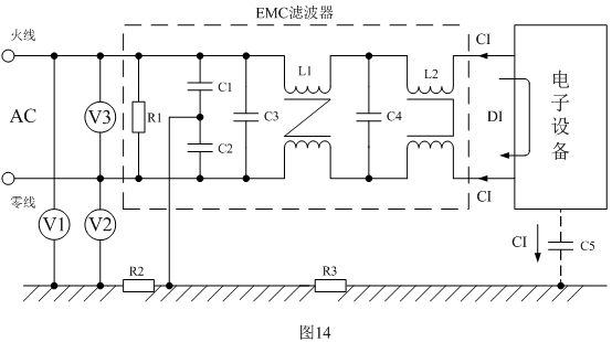 圖14是根據(jù)上面分析而設(shè)計的EMC(電磁兼容)濾波電路,EMC濾波電路如虛線框內(nèi)所示。