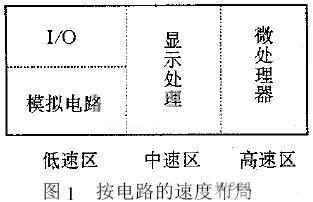 單元電路工作頻率越高,速度就越快,信號(hào)的頻譜也就越豐富;高頻分量比例越大,對(duì)外干擾也就越強(qiáng)。可根據(jù)單元電路的工作頻率分為高速電路(如微處理器),中速電路(如顯示處理),低速電路(如接口)和模擬電路(如模擬信號(hào)放大器)。多種速度電路在印制板上的布局一般如圖1所示。