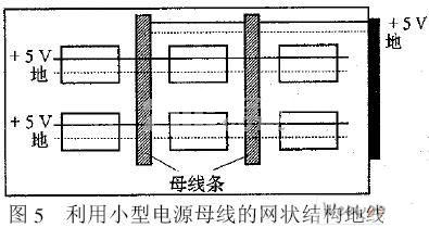 對(duì)于同類單元電路(或元器件)提高電磁兼容性效果的有效方法是采用網(wǎng)狀結(jié)構(gòu)地線如圖4所示。圖中實(shí)線為正面軌線,虛線為反面軌線,實(shí)線與虛線相互垂直,交叉點(diǎn)處由金屬化孔連接。這樣電流可以就近回流。圖4中的垂直地線可能給正面布線造成一定困難,可用小型母線來(lái)替代,并與電源供電線連結(jié)起來(lái)如圖5所示。圖中垂直的寬線條代表小型電流母線,可以裝卸,便于調(diào)度。