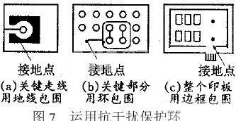 4.2在敏感元器件接線端頭和印制板的邊框用地、環(huán)保護(hù)起來(lái),如圖7所示。注意保護(hù)環(huán)不能充當(dāng)電流回線,只能單點(diǎn)接地。