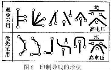 4.1 走線形狀不要有纏結(jié)和分支或硬拐角。因?yàn)槟菢涌赡軙?huì)破壞導(dǎo)線特性阻抗的一致性或?qū)е路瓷浜彤a(chǎn)生諧波或局部高電壓引起放電現(xiàn)象。一般優(yōu)先選用和避免采用的印制導(dǎo)線形狀,如圖6所示。