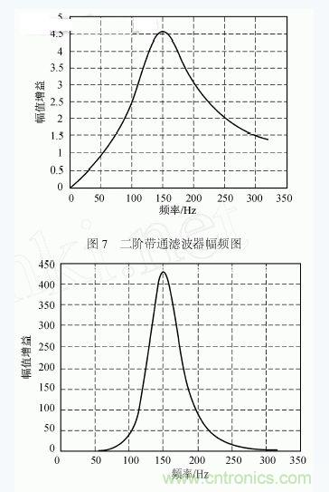 為此,我們對(duì)信號(hào)進(jìn)行較高Q值的窄帶濾波,使用二階壓控型有源帶通濾波器作為濾波單元,其原理圖及頻率特性如圖6、7所示。