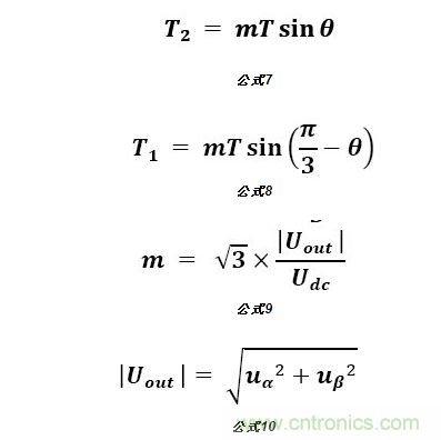 由此可知SVPWM實(shí)現(xiàn)步驟:先通過(guò)Uout判斷出電壓矢量所在扇區(qū),再根據(jù)相鄰的電壓矢量及Uout計(jì)算出兩個(gè)基本矢量作用時(shí)間;最后根據(jù)兩個(gè)基本矢量作用時(shí)間計(jì)算出PWM開關(guān)時(shí)間及占空比。