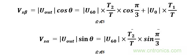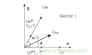 由8個(gè)基本電壓空間矢量可以合成任意定子電壓矢量。如圖4所示,以U0, U60扇區(qū)為例,若在一個(gè)PWM周期T內(nèi),同時(shí)輸出T1時(shí)間U0矢量和T2時(shí)間的U60矢量,則由矢量(T1/T)U0,(T2/T)U60可以合成給定的參考電壓矢量Uout。