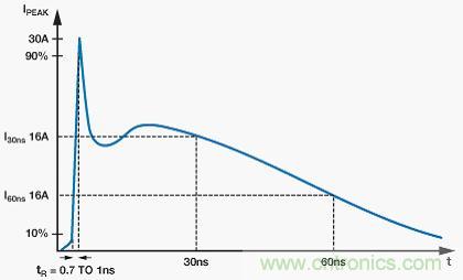 圖1顯示了規(guī)范所述的8 kV接觸放電電流波形。一些關(guān)鍵波形參數(shù)包括小于1 ns的上升時(shí)間和大約60 ns的脈沖寬度。這說明脈沖總能量約為數(shù)十mJ。