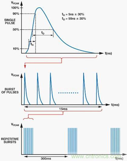 電快速瞬變測試要求將數(shù)個(gè)極端快速的瞬變脈沖耦合到信號(hào)線上,以代表容性耦合到通信端口的外部開關(guān)電路的瞬態(tài)干擾,這種干擾可能包括繼電器和開關(guān)觸點(diǎn)抖動(dòng),以及切換感性或容性負(fù)載引起的瞬變,所有這些在工業(yè)環(huán)境中非常常見。EC 61000-4-4中定義的EFT測試嘗試模擬因?yàn)檫@些類型的事件產(chǎn)生的干擾。