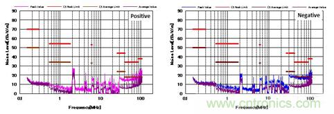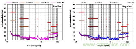 圖4顯示了增加CM和DM濾波器后的噪聲特性。 與圖3相比,CM濾波器的增加降低了近20dBμV/ m的CM噪聲。 并且EMI性能也通過了CISPR25 C5標準。
