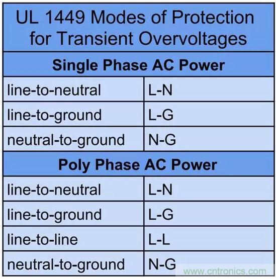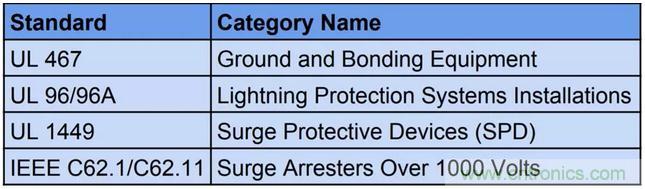 美國保險商實驗室(Underwriter’s Laboratory)所列的數種避雷防護標準主要針對浪涌保護中采用的設備(見表2)。其中,浪涌保護器件標準UL1449規(guī)定了瞬態(tài)電壓電氣路徑在各種系統(tǒng)供電方式下所需采取的保護模式。