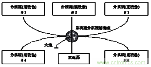 單點接地要求每個電路只接地一次,并且接在同一點,并設置一個安全接地螺栓,防止來自兩個不同子系統(tǒng)( 有不同的參考電平) 中的電流與射頻電流經(jīng)過同樣的返回路徑,從而導致共阻抗耦合。
