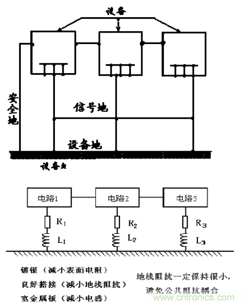 (3)噪聲和干擾抑制:對內(nèi)部噪聲和外部干擾的控制需要設備和系統(tǒng)上的許多點與地相連,從而為干擾信號提供最低阻抗的通道。