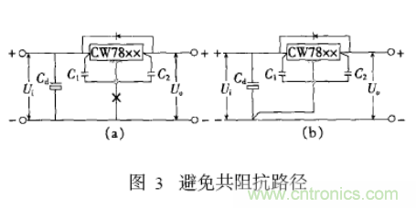 電源線的布置要根據(jù)電流的大小盡量加粗走線寬度。在布線工作的最后,用地線將電路板沒有走線的地方鋪滿(大面積) 。在接地時還需要避免共阻抗路徑,如圖8-10所示穩(wěn)壓器電路的“調(diào)整端的取樣點”或“公共點”,千萬不能接在有負載電流流過的輸出線和公共地線上如圖(a)所示,應從管腳’根部’單獨另外用引線引出如圖(b)所示。