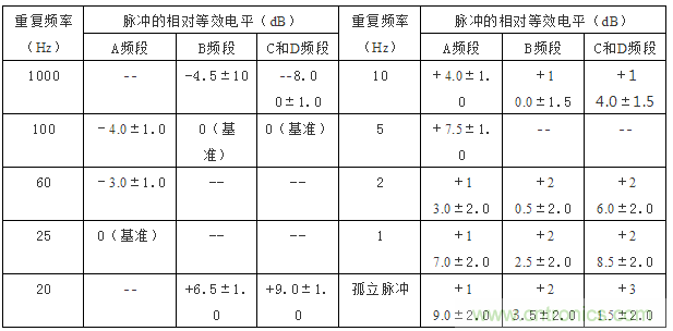 所謂相對(duì)脈沖特性指輸人周期性脈沖信號(hào)時(shí),脈沖的重復(fù)頻率越高,其讀數(shù)越高,重復(fù)頻率低,讀數(shù)低。當(dāng)讀數(shù)不變時(shí)輸人脈沖的幅度和重復(fù)頻率的關(guān)系應(yīng)符合表4的規(guī)定。