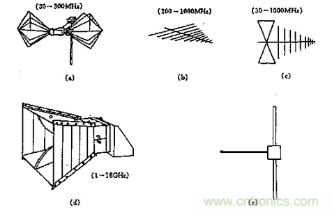 (a) 雙錐天線(xiàn) (b)對(duì)數(shù)周期天線(xiàn) (c)混合寬帶天線(xiàn) (d)喇叭天線(xiàn) (e)對(duì)稱(chēng)振子天線(xiàn)