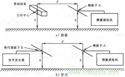圖7所示為替代法測(cè)試的方法和布置。首先用半波振子天線(xiàn)A和測(cè)量接收機(jī)測(cè)量出EUT的最大騷擾值,然后用半波振子天線(xiàn)B替代EUT。調(diào)節(jié)信號(hào)發(fā)生器輸出功率,直至測(cè)量接收機(jī)達(dá)到同樣的值。記錄替代天線(xiàn)B的輸入端功率,即為EUT的殼體輻射功率。