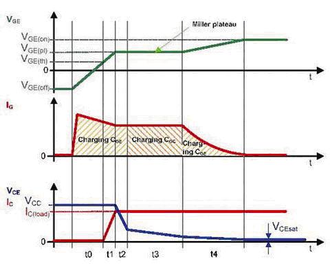 正如IG=f(t)圖所示,導(dǎo)通過程可以分為三個階段。分別是柵極-發(fā)射極電容的充電,柵極-集電極電容的充電和柵極-發(fā)射極電容的充電直至IGBT全飽和。柵極電流IG對輸入電容進(jìn)行充電,IGBT的導(dǎo)通和關(guān)斷特性由與充電過程有關(guān)的電壓VGE和VCE來體現(xiàn)。在關(guān)斷期間,所描述的過程運(yùn)行在相反的方向,電荷必須從柵極上移除。
