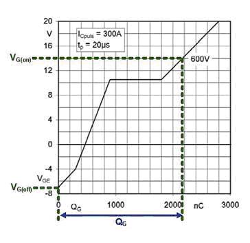 總的刪極-發(fā)射極電壓可通過考慮所施加的柵極導(dǎo)通電壓VG(on)和關(guān)斷電壓VG(off)之差來進(jìn)行計(jì)算。圖3中來自IGBT數(shù)據(jù)表的圖表顯示了在正象限和負(fù)象限的柵極電荷曲線。如果柵極電荷曲線只在正象限給出,則柵極電荷的幅值可由外插法讀出。即使在沒有柵極電荷曲線的情況下,通過使用輸入電容Cies=CGE+CGC這一準(zhǔn)確度稍差的方法也能確定柵極電荷。