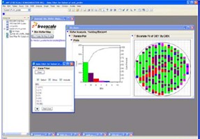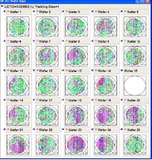 例如,飛思卡爾的工程十分用半導(dǎo)體行業(yè)中常見的晶圓圖Wafer Plot來初步分析晶圓的缺陷,以下兩個圖形就是運(yùn)用JMP軟件繪制而成的。第一張圖顯示的是單個晶圓的質(zhì)量特征,并配有帕累托圖Pareto Plot展示芯片的良率狀況和各種缺陷出現(xiàn)的頻次。第二張圖則是從整體層面顯示一個批次Lot產(chǎn)品的質(zhì)量特征(一般來說,飛思卡爾規(guī)定25個晶圓組成1個批次)。