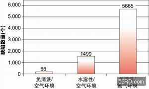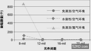 圖2是三種不同組裝工藝中錫橋與元件間隔之間的關(guān)系。從圖中看出,元件間隔在0.012英寸或更大時沒有發(fā)生任何錫橋。免清洗焊膏在空氣環(huán)境中焊接產(chǎn)生的錫橋數(shù)量最少,為14個;水溶性焊膏在空氣環(huán)境中焊接產(chǎn)生的橋接數(shù)量排在第二,為99個;而免清洗焊膏在充氮環(huán)境中焊接產(chǎn)生的橋接數(shù)量最多,有866個。此外在最小的0.008英寸間距下,用免清洗焊膏在空氣環(huán)境焊接時18種焊盤中有12種焊盤沒有產(chǎn)生任何錫橋,用水溶性焊膏在空氣環(huán)境中焊接時有10種焊盤沒有錫橋,而使用免清洗焊膏在充氮環(huán)境中焊接時只有6種焊盤沒有產(chǎn)生錫橋。